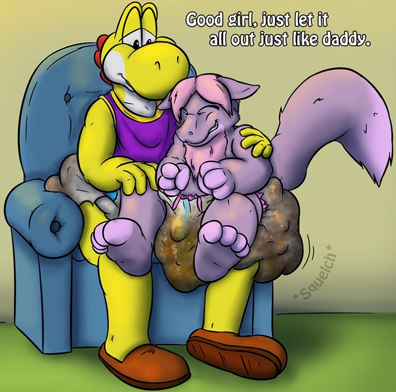 Kin being coaxed by Showtime to use her diapers. Seems she had much more to expunge than the dino.