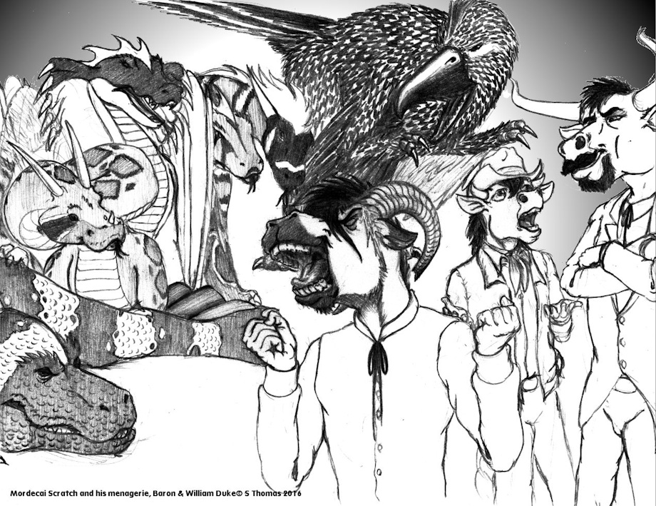 In the century before The Hood and his contemporaries battle against (or for) evil, their ancestors struggled for the control of the town of Wylder. Power hungry Baron Duke (far right) would hire the likes of the insane scientific genius, Moredcai Scratch, to face off against Katie Wylder, the mayor, sheriff, and owner/proprietor of the Wylder Hotel/Saloon/entertainment club with his menagerie of genetically-modified creations such as the lumbering but powerful King Gila, dragon-snakes Fafnir, Cleopatra, Jerboa & George, and the monsterous Roc. Young William Duke vainly tries to reason with his father, not realizing that Scratch isn't craziest one among their gathered group.