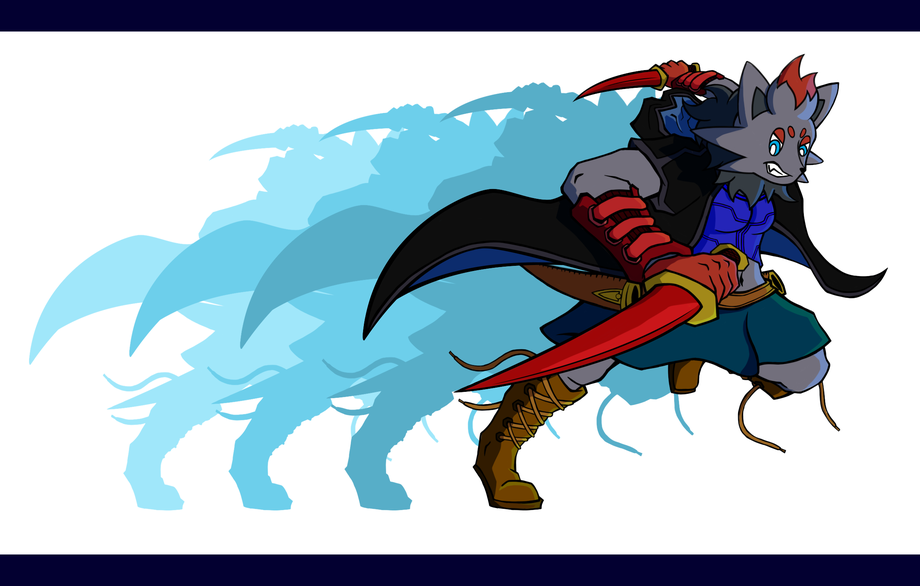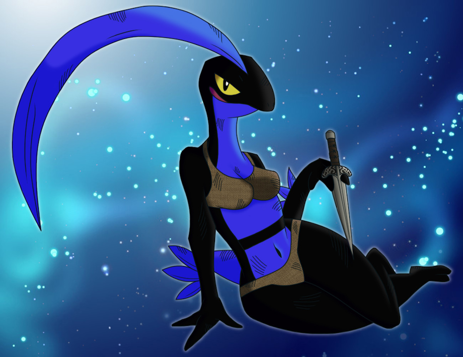 A black Grovyle with blue stomach and leaves. carries usually three staves to cast spells without magica and a dagger and a sword for close combat.