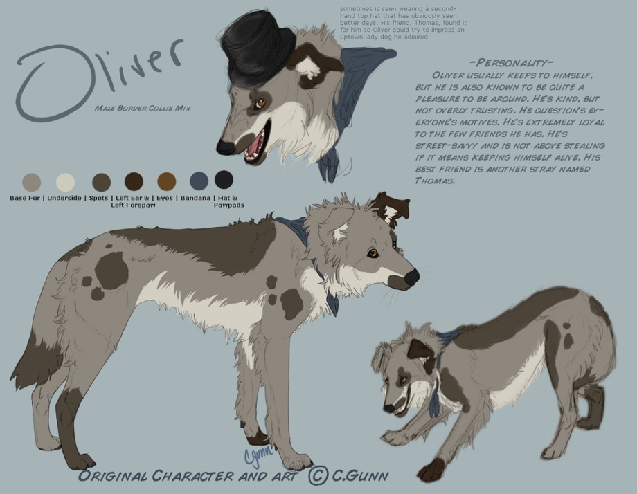 Oliver was created on a whim in 2008 because I was bored in class and drew a mutt with a top hat. I still love him to death so... he needed a new ref. =]