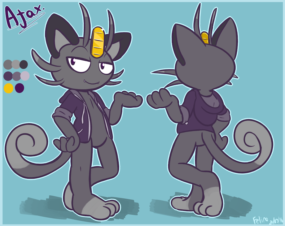 He is a alolan meowth with dark tone fur and gray color feet, tail, and tips of hair.
