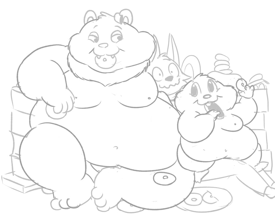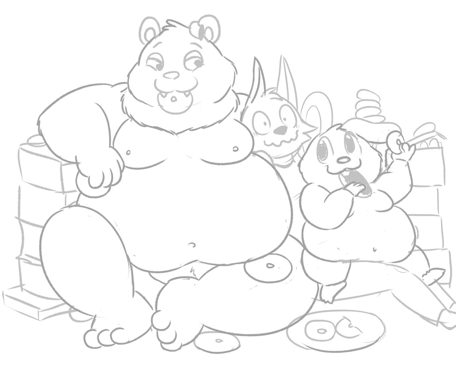 Happy Anniversary to my buddies Zanny and Foxune - they wanted a donut-themed picture with the three of us together. :D And haha, I actually had to draw them fatter a number of times, so if you like fattening and weight gain, there's a lil for ya!