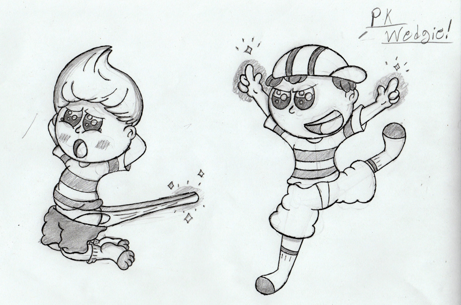Been a rough month honestly. My wrist needed a rest from mouse inking and video editing so while I'm resting I finally got around to drawing another pic of Ness along with Lucas. I can't remember who exactly asked for it but here it is. A PK wedgie. Sorry for taking so long. ^^