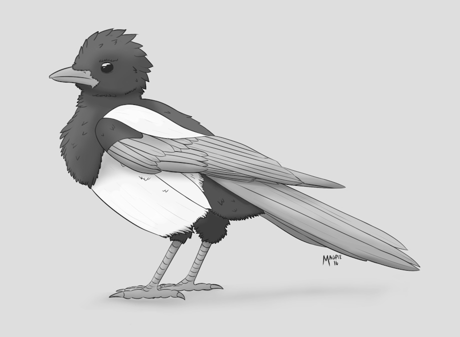 After building up from saucy to outright sexual, for day three a friend suggested I take a crack at a bird pal--and what better than my namesake! Just a grumpy looking little floofy magpie here to look all imperious!