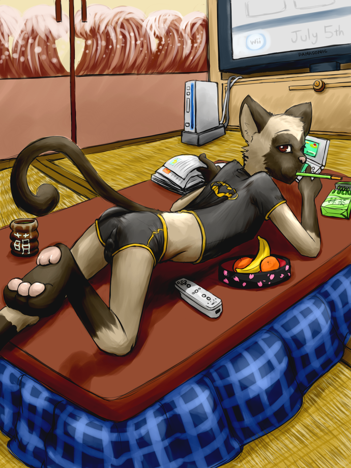 A brief-loving kitty chillaxing in a very Japanesque room on a nice afternoon, playing some games~ He doesn't seems to be bothered by your intrusion, maybe you'll like to play with him? ;3