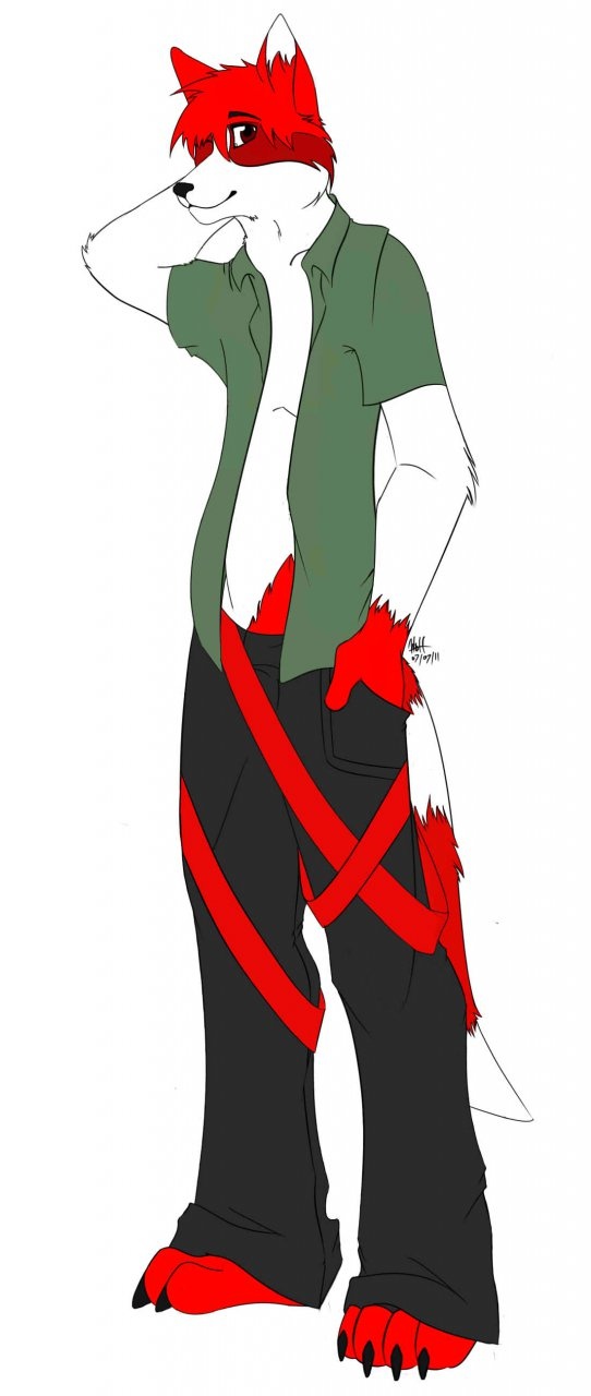 dark red eye :3 trick pants, red hair, ears, all paws and happy trail, 3 red stripes on tail