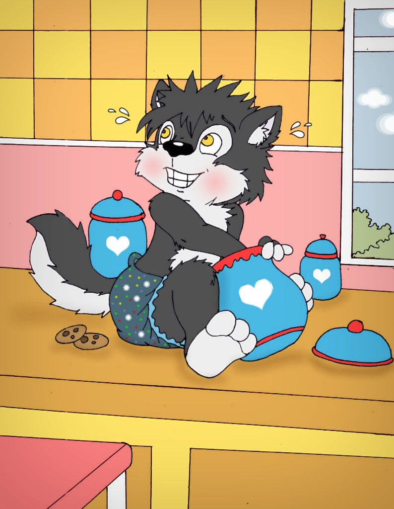 Based on a conversation I had with Loupy, my friend and I decided to make this drawing! It seems that for this coming Halloween, Loupy is ready with his "big bad wolf" costume...maybe isn't ready yet, because his mommy is doing some diaper checks first!