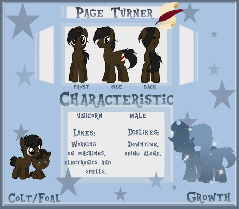 Page at first glance would be your run of the mill book worm Unicorn but he is pretty smart when it come's too any thing too do with Electronics so you would think his cutie mark would have something too do with it nope his cutie mark is a blank book with a quill next too it showing that his skill's are only limited by what he puts his mind too that was kind of how he found out that he can use his magic to turn him self into a Pegasuses