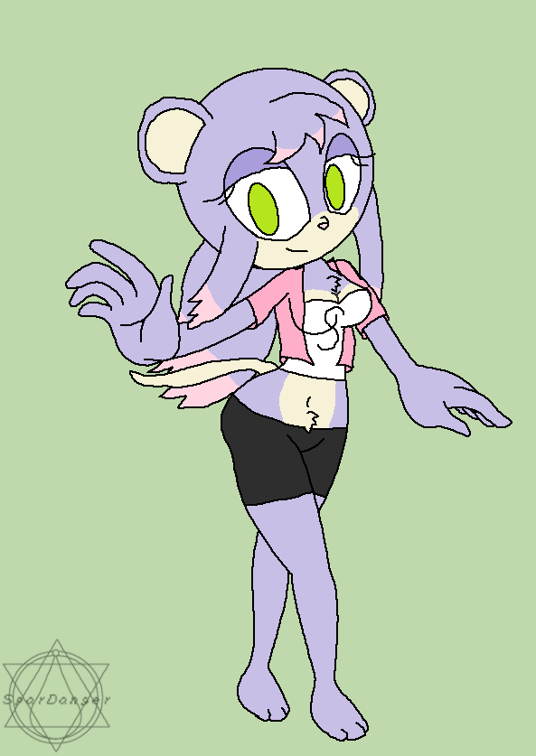She wears a pink open shirt, a white strapless top with an "S" on it (an allusion to her young twin sister's "K" that she wears in her outfits), and black barely up shorts (inspired by [largethumb]1216995[/largethumb] and also to accent her sexiness) The fur above her shorts is her pubic fur.