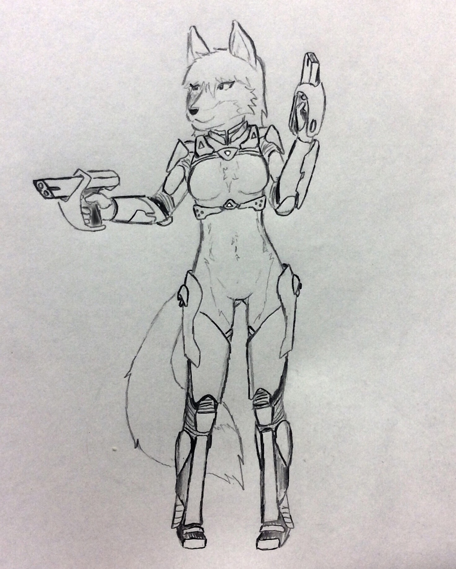 Ref sheet; http://www.furaffinity.net/view/19798576/ Owner; iconLionclaw on Furaffinity.net This version was drawn clothed in fur the way cartoon animal people sometimes are. When the butt cheeks are visible from the front that is called a notch sometimes. To clarify those are the underside cheeks and not genitals. This was a recent request based off of my previous art of scifi armor with no torso coverage. The pistols were given knuckle guards mostly because that meant I wouldn’t have to draw the underside of the hand. The hip tilt to her left was based off of a pose I saw. The hip plates were given thrusters since if you’re not wearing much ballistic protection besides force fields then you’d at least want rocket powered movement.