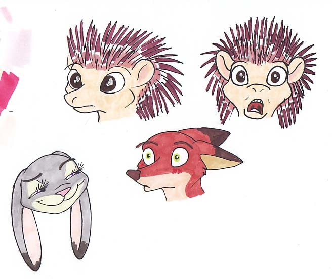 Spent a few days with Huskie666 drawing and just hanging out. She got this long time digital artist to practice with a few different physical tools. Two random hedgehog heads with Nick and Judy colored using alcohol based markers.