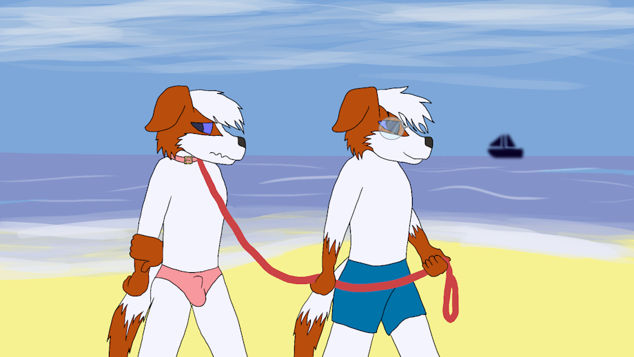 Remi and Sammy wanted to have a walk on the beach. Pity there was only one pair of trunks between them.