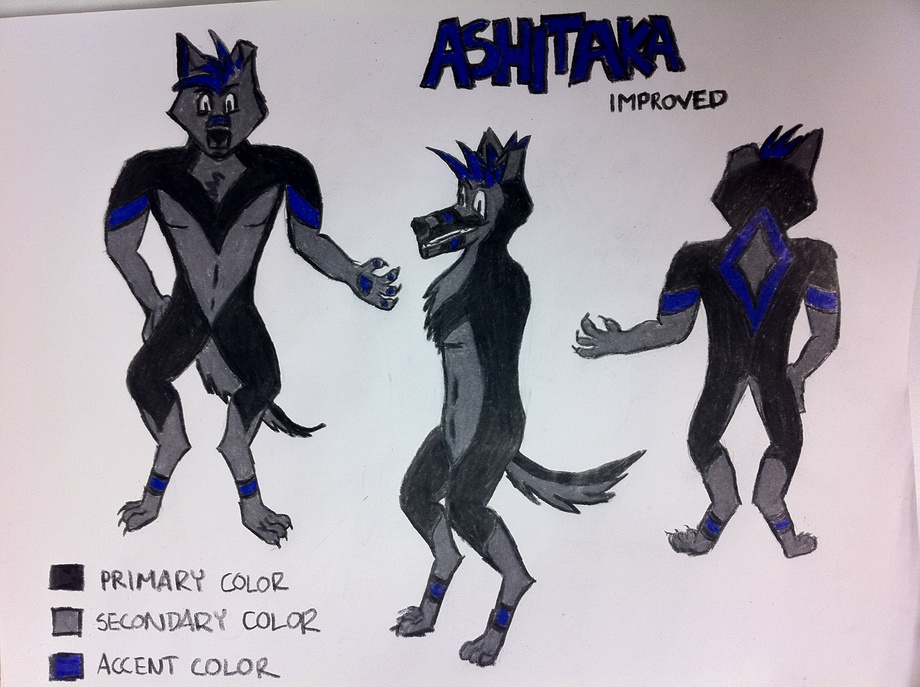 I'm really looking for comments here. This reference sheet is a serious contender for my final fursuit design. Here, I've added a little bit more black to break up the previously all gray chest area, and removed the blue and black lines around that wrists (I decided they looked like 1980's sweatbands and didn't like that look). Beyond that, and the slightly improved art (practice makes perfect you know ;)), there's not a whole lot different aside from the blue accents on the biceps which looks better.