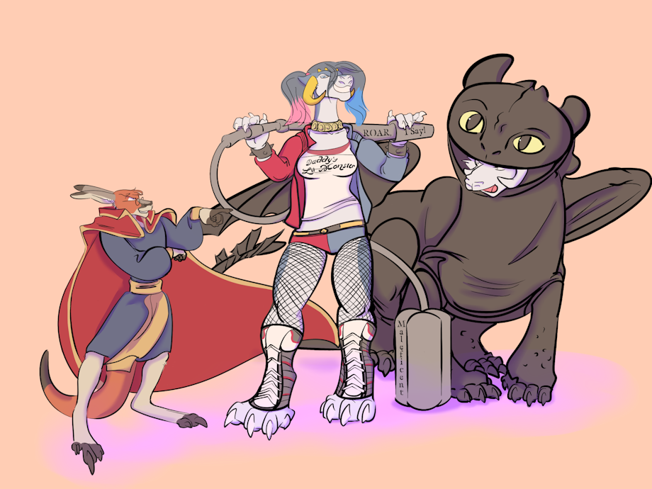 After last years Halloween terror fest... https://inkbunny.net/submissionview.php?id=720740 I asked Celeste to find somethin less hair(or fur) raising. This year I went as Doctor Strange, Gerhardt mad a Toothless quad-suit and Celeste as Harley Quinn (not too bad) with the flame thrower she named "Maleficent" (trouble). Luckily there were no incidents or any that would've provoked her to create some.