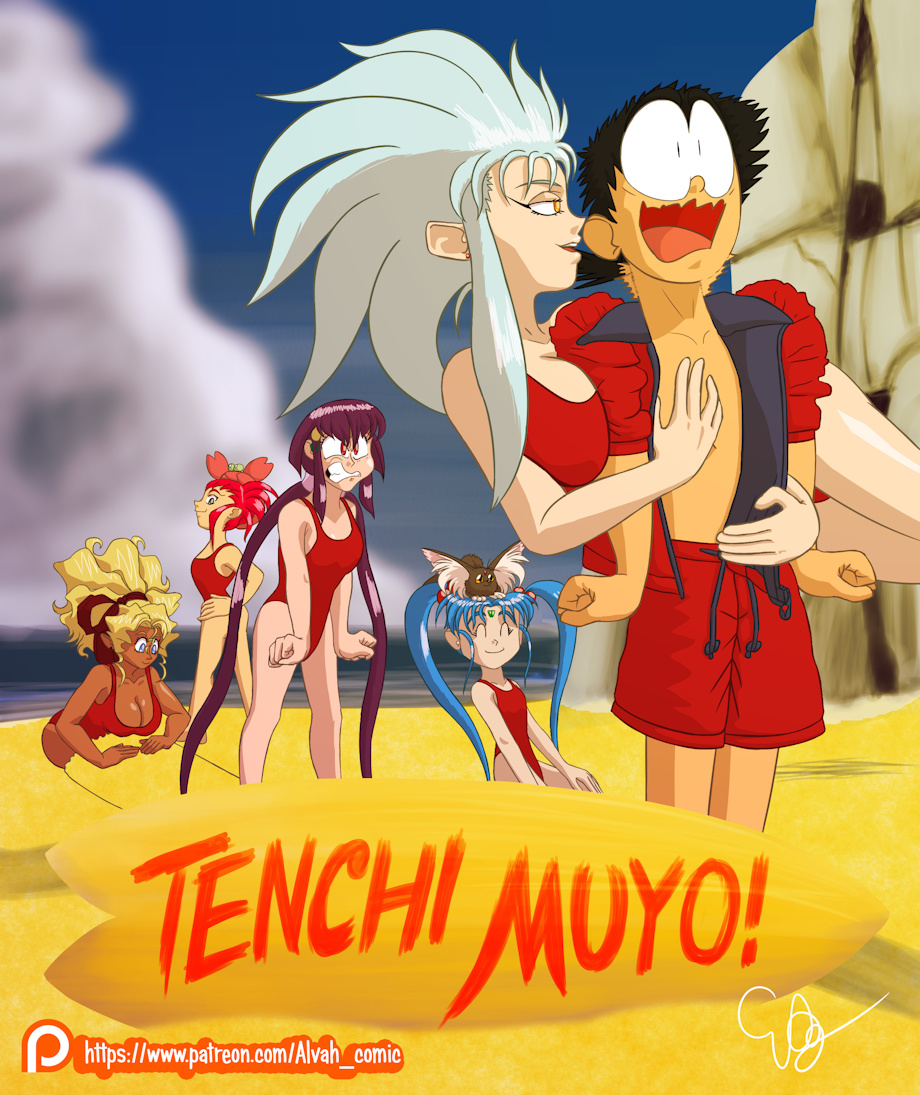 To put it simply, he wanted Tenchi and the gang in an homage to Baywatch. It at least gave me a great excuse to draw Tenchi in Hasselhoff uniform.