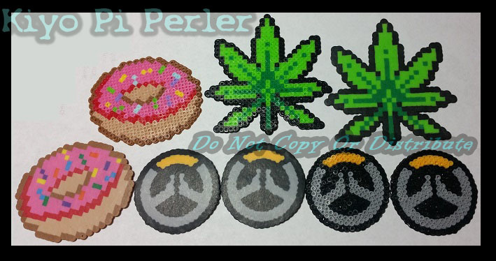 Doughnuts, Pot Leaf and Over Watch charms for MFF: Please note that the pot leaf and Over Watch were both original patterns (not concepts or designs obviously), however the doughnut is NOT mine, and was edited from one that was found online, original artist wasn't listed. Toradoshi made the pot leaf from scratch and I did the Overwatch symbols free hand on the circle boards. Will have larger versions at the con...