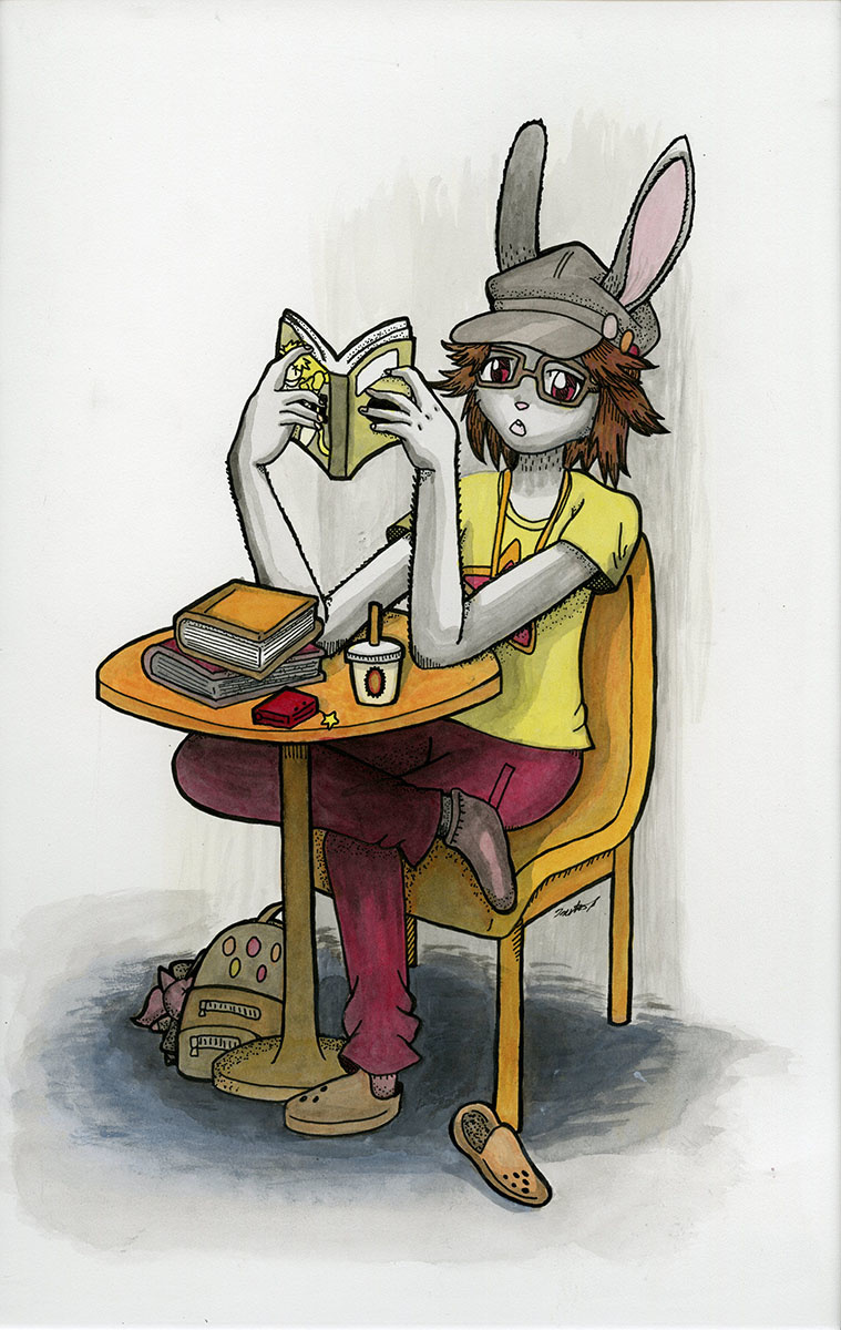 A colored wash piece featuring my less-exagerated "furrsona" Tiana Rabi, who looks more like me with less fat.
