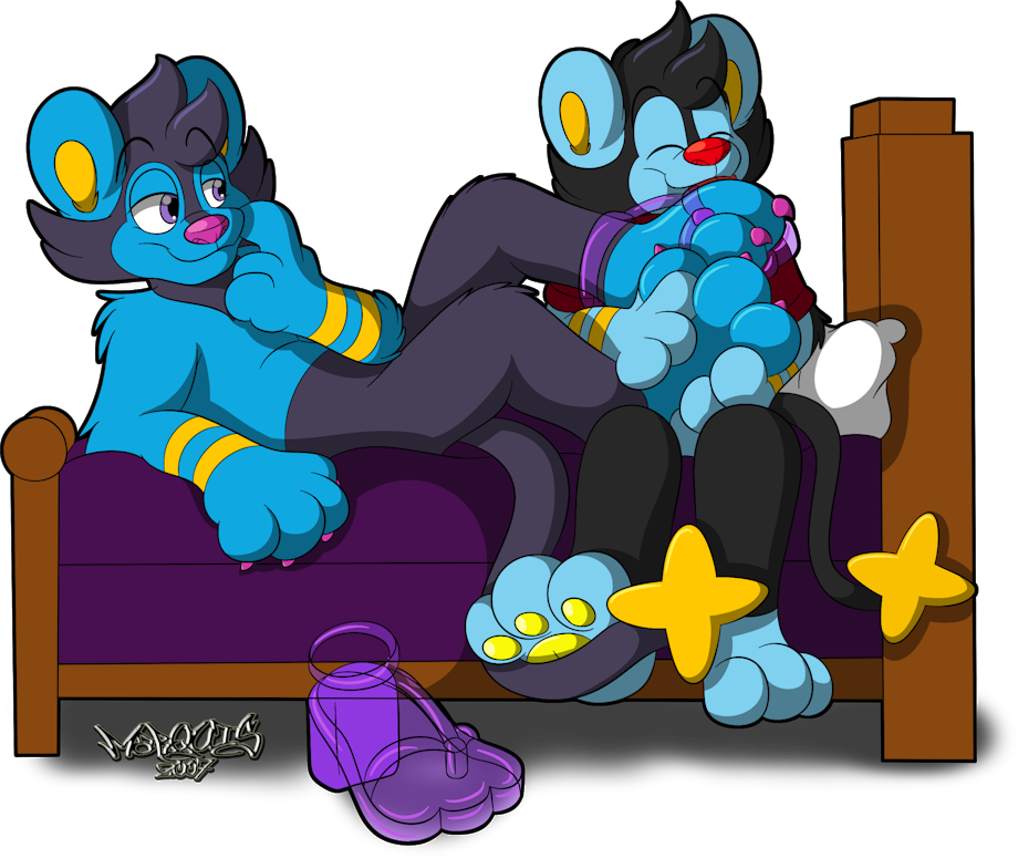 Seems now Twinkle's got a new number 1 fan, enough for him to let his lemon cookie (that's how he calls him xD) enter his house, his room and just plop on the bed to bask onto those big, sweet scented feetpaws of his :P Notice he does have his dance shoes partly on, but his dancesuit is nowhere to be found, Chriso probably stripped the poor kitty naked! xD