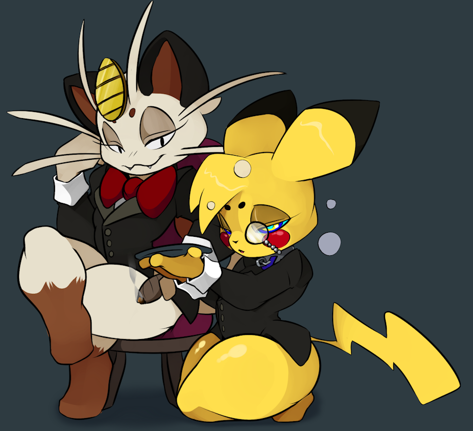Commission for valtz . Sort of a follow up to a pic I did years ago (so long it looks like it was done by a completely different person) and is sort of an inverse of that pic's context, as in the old one, it was the Meowth character behind hypnotized by the dapper Pikachu, and now the tables have turned.