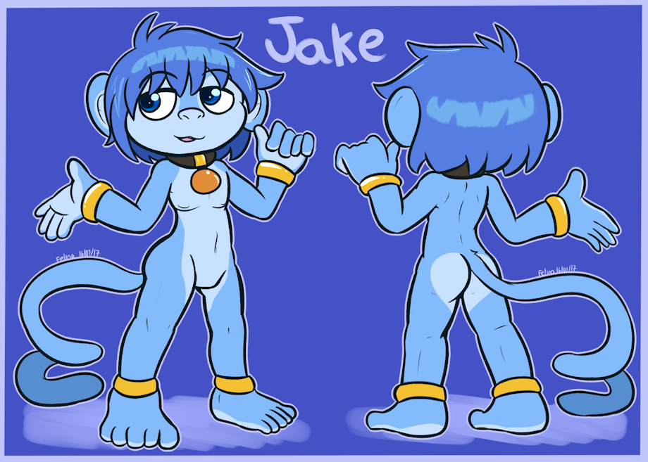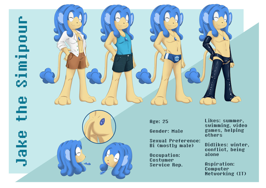 Jake is a simipour. His height is 3'07" he is four inches taller than a average simipour. Also has thick tuffs on his head, shaped like dread-locks and are slightly longer. Jake has a nice toned body thick as a simisage. On his lower back, he has a marking shaped like a water stone.