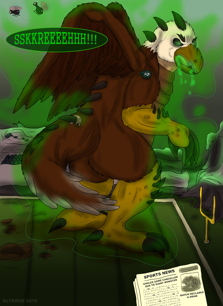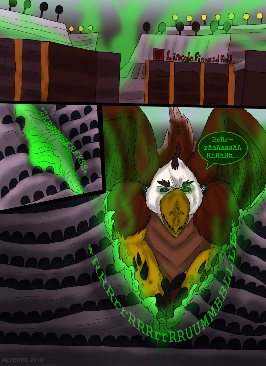 The new kaiju-eagle stands in what remains of the now-abandoned stadium as helicopters surround him and the media declares the game a draw, but the individual who caused this mayhem is nowhere to be seen!