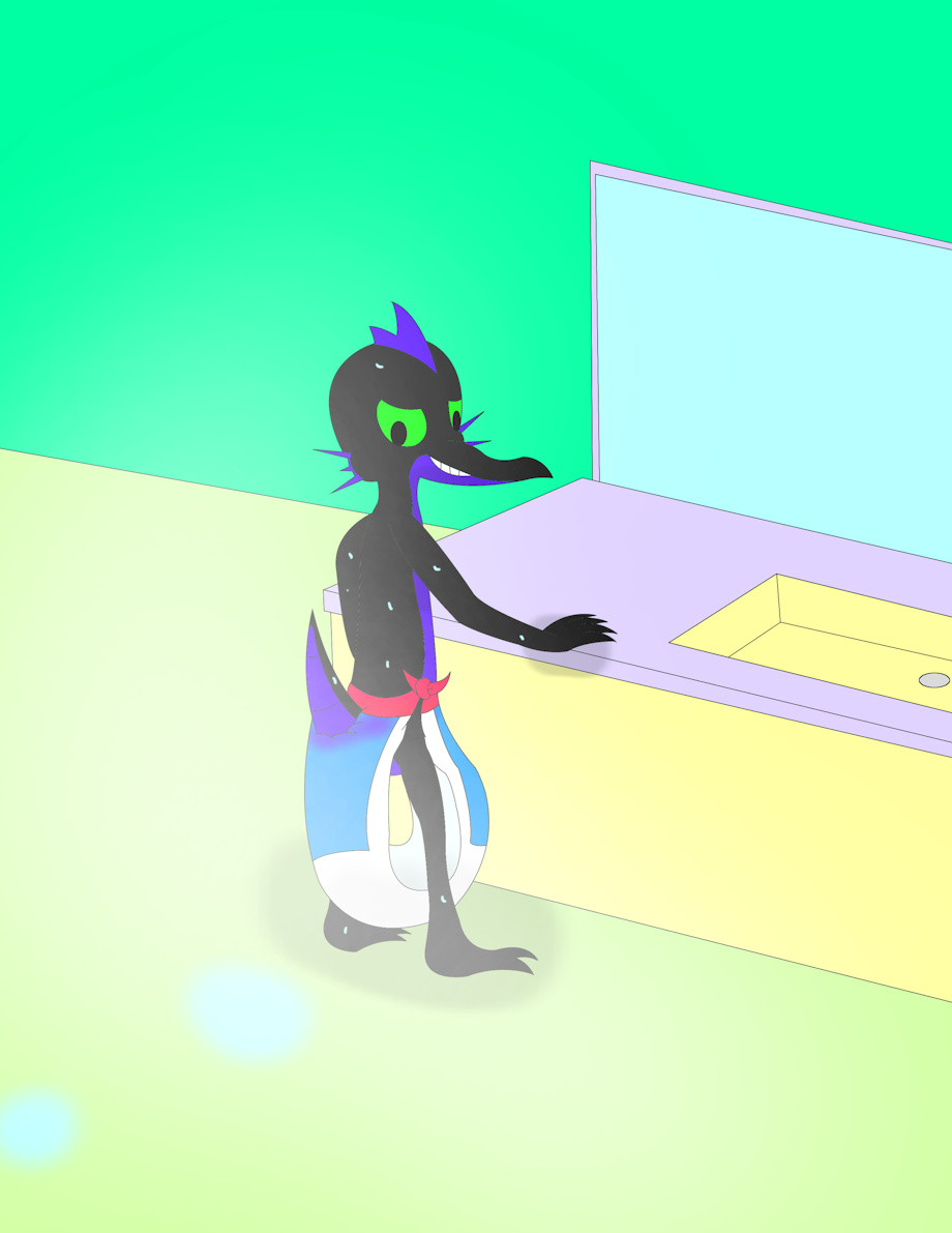 Looking down, he saw his pelenka, which he wore in the shower, now sagging heavily between his legs. He smiled with a hint of smug as he shook his hips back and forth, causing his diaper to bob back and forth. The Diapered Adult Dragon dried himself off with the towel, leaving his sagging diaper on for further enjoyment. He left the bathroom and felt his undergarment drag along the floor.