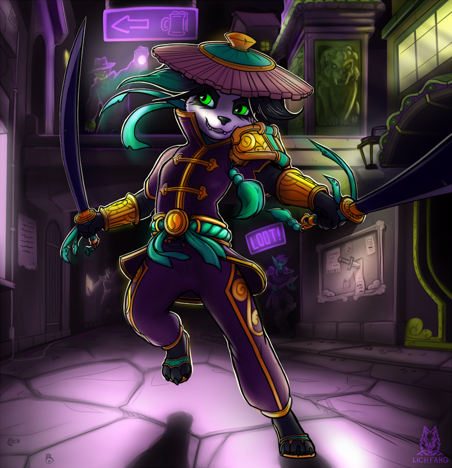 of their Pandaren character Jade dressed in some Lotus agent attire from the recent Hearthstone expansion set in Gadgetzan. I tried experimenting with digital painting for the background which turned out alright, but I have a lot of neglected practice to catch up on in digital painting. anyway enjoy.