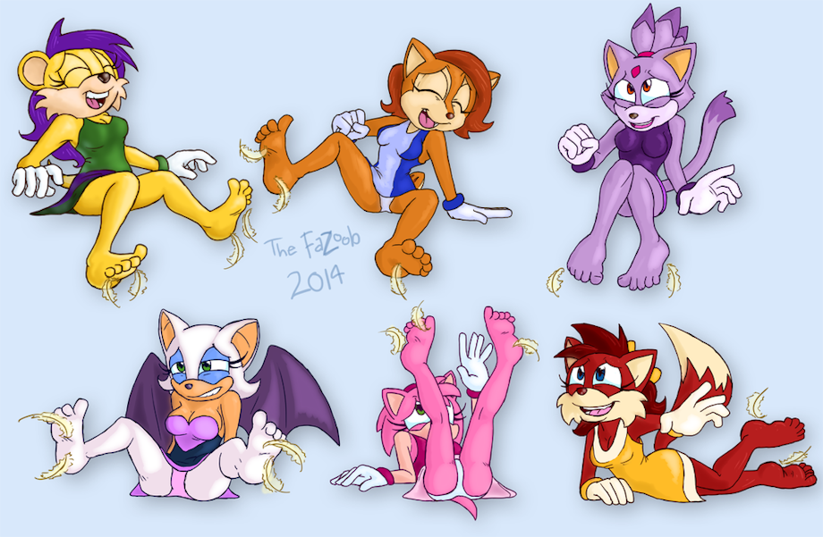Another pic drawn for me by TheFazoob on DeviantArt. Here, we have Amy Rose, Rouge the Bat, Blaze the Cat, Sally Acorn, Mina Mongoose and Fiona Fox all in the same ticklish scenario; feathers are tickling their feet. Amy and Blaze are wearing their London Olympics gym attire while Rouge, Sally, Mina and Fiona are wearing gym attire I made them. Also, Rouge's legs are covered in white fur because that's how another friend of mine on DeviantArt draws them.