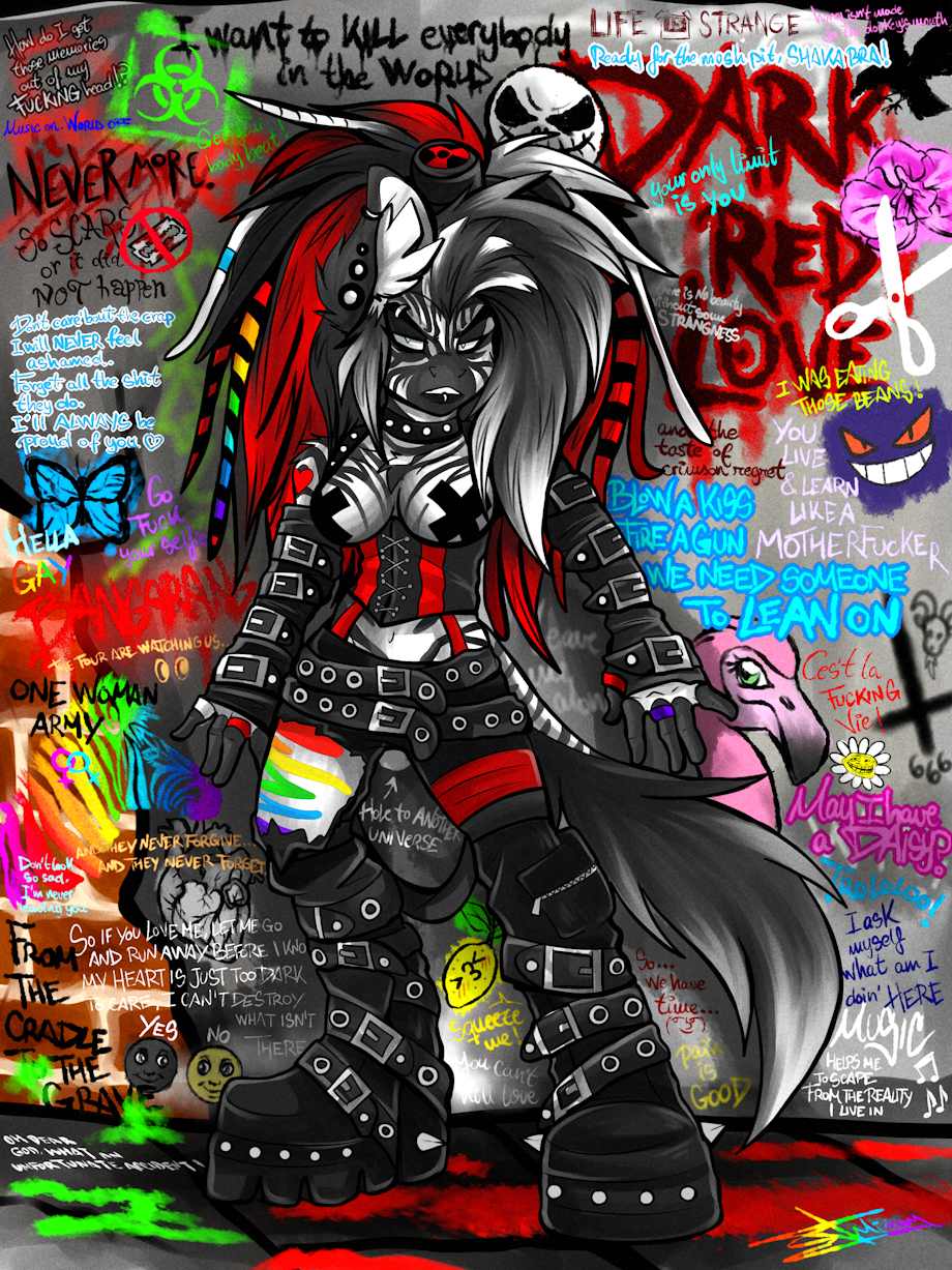 I´m very proud of this pic, it has a lot of shit around X'D those graffitys are about songs that she like, phrases, quotes of videogames (Hollywood Monsters and Life is Strange) and a lot of crap; when I started this I didn´t thought on what it will become... just ideas and inspiration flyed out of me! X'D