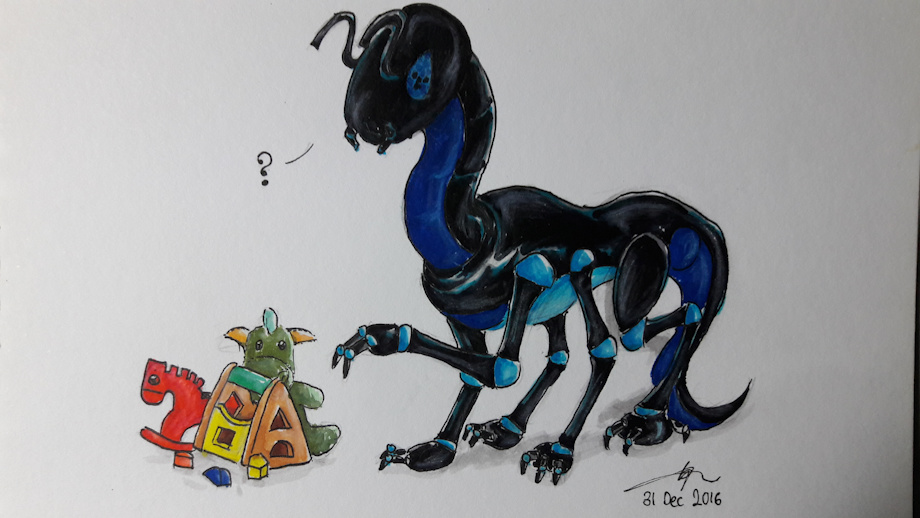 it seems one of the aliens i made found its way into an abandoned town and found an old house to live in for the night, but once they got into a room they found a bunch of strange objects on the floor in many colors and shapes, seems their really confused by these objects but pokes the toy rocking horse and backed up as it rocked in place. "what are these things?"