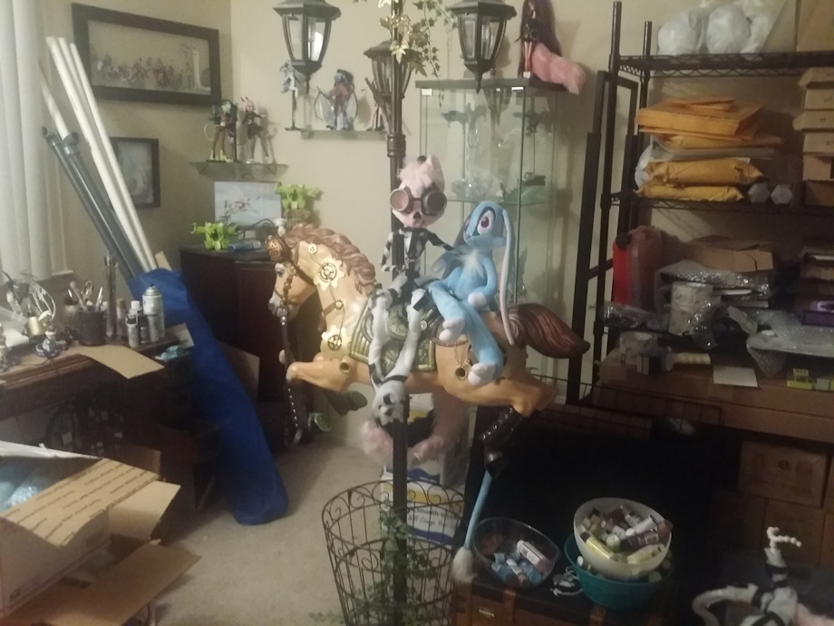 It's full of things I've been meaning to post public pictures of, but just haven't gotten to it yet. You can spot from clockwise: a Tinsel Barbie, shipping supplies and the last of the mugs, a Vi skeleton, how I separate the figurine's paints, an LED steampunk carousel horse, my Vi first skeleton and Whip prototype, a box of finished ryuus for the kickstarter, some of the Mace sets for the kickstarter, our pipes that hold the sign at conventions, a 3D picture of the starfall mountains, one of the character line-ups in a float frame, Lilith and Namah custom Monster High dolls, the only Prelude book to survive the apartment fire (it was in my bag) two failed Gregori figurines who broke their mold, more Monster High customs of Wisp and Vanth, and finally, a curio of painted miniatures. I'll post the other half of the room some other time, it's a bit messy.