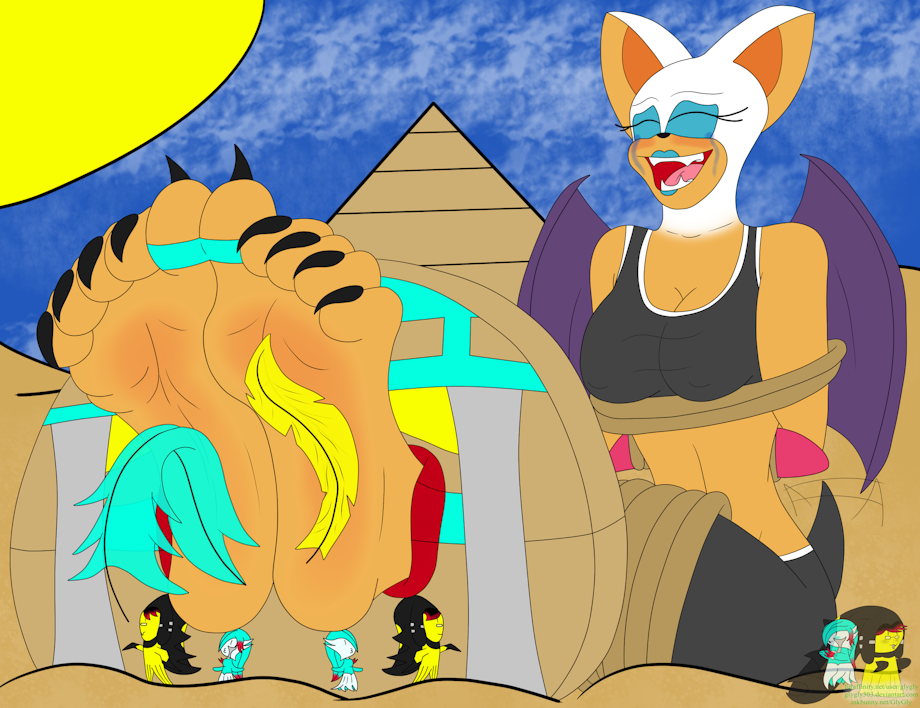Here, we have Rouge the Bat in her Sonic Riders outfit stocked as some feathers tickle her bare feet in Sand Ruins. As you can see, she is laughing painfully with her arms tickle her bare feet locked up in stone stocks with her big toes tied together and her arms tied behind her back.