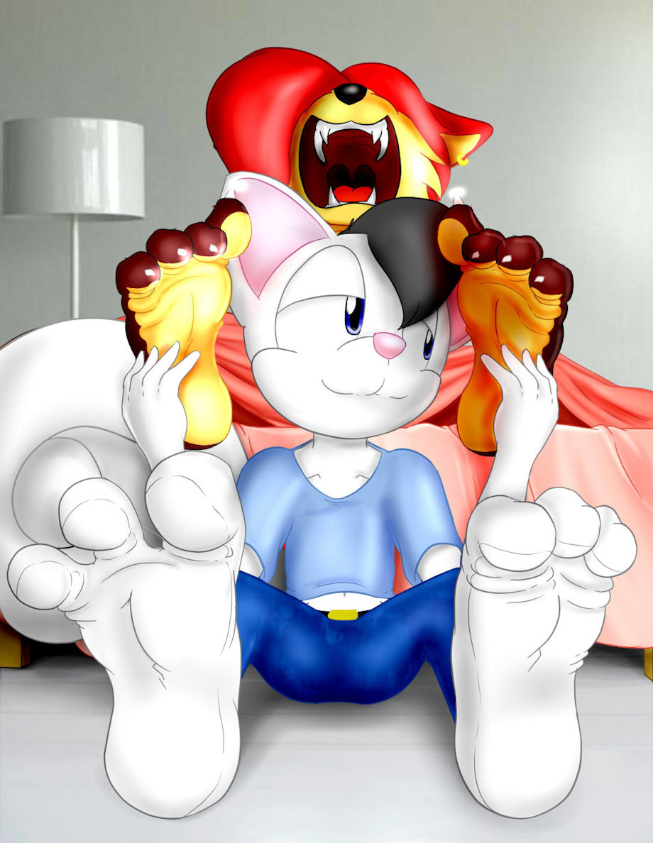 Here's a pic my good friend XPTZStudio made me on DeviantArt back in 2015. It's my fursona, Louis Squirrel, tickling the feet of his OC Fire the Fox. As you can see, Fire either looks to be laughing or yawning while Louis tickles her feet.