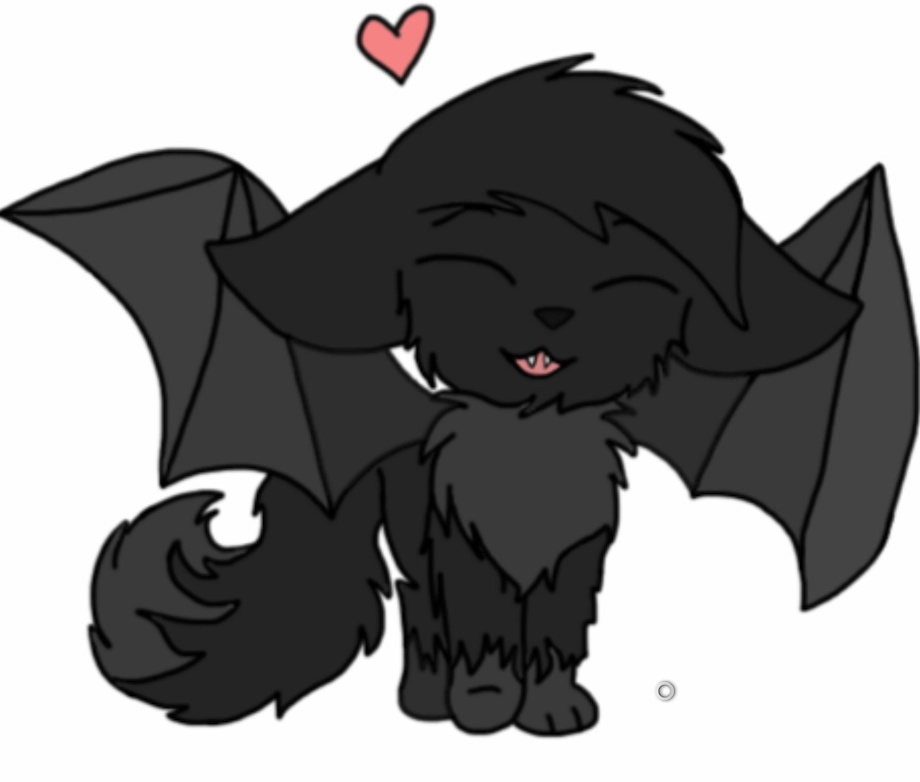 Kiko is a black and grey batkitten (mother was half angora/black domestic shorthair, father was fruitbat). She has black fur with charcoal grey tips on her tail and paws, along with a neck fluff. She is quadrupedal with wings which are a gradient grey and black in the membranes. She has a long black side swept fringe of hair that covers her blue and gold eyes. Her ears are large and broad (like a fennec fox) and her overall size is quite small. Her tail and neck fluff is incredibly soft and bushy, and the rest of her fur is medium length, as typical of an Angora cat. Her head is rounded and her features are more kitten-like than bat.