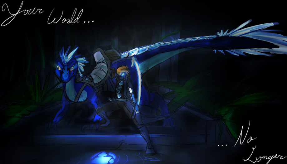 decided to do some conceptual speed painting/sketching today, and worked up this piece, based on a concept i've been mulling over in my mind about a parallel existence of dinosaurs and humans that has reached a post apocalyptic status.