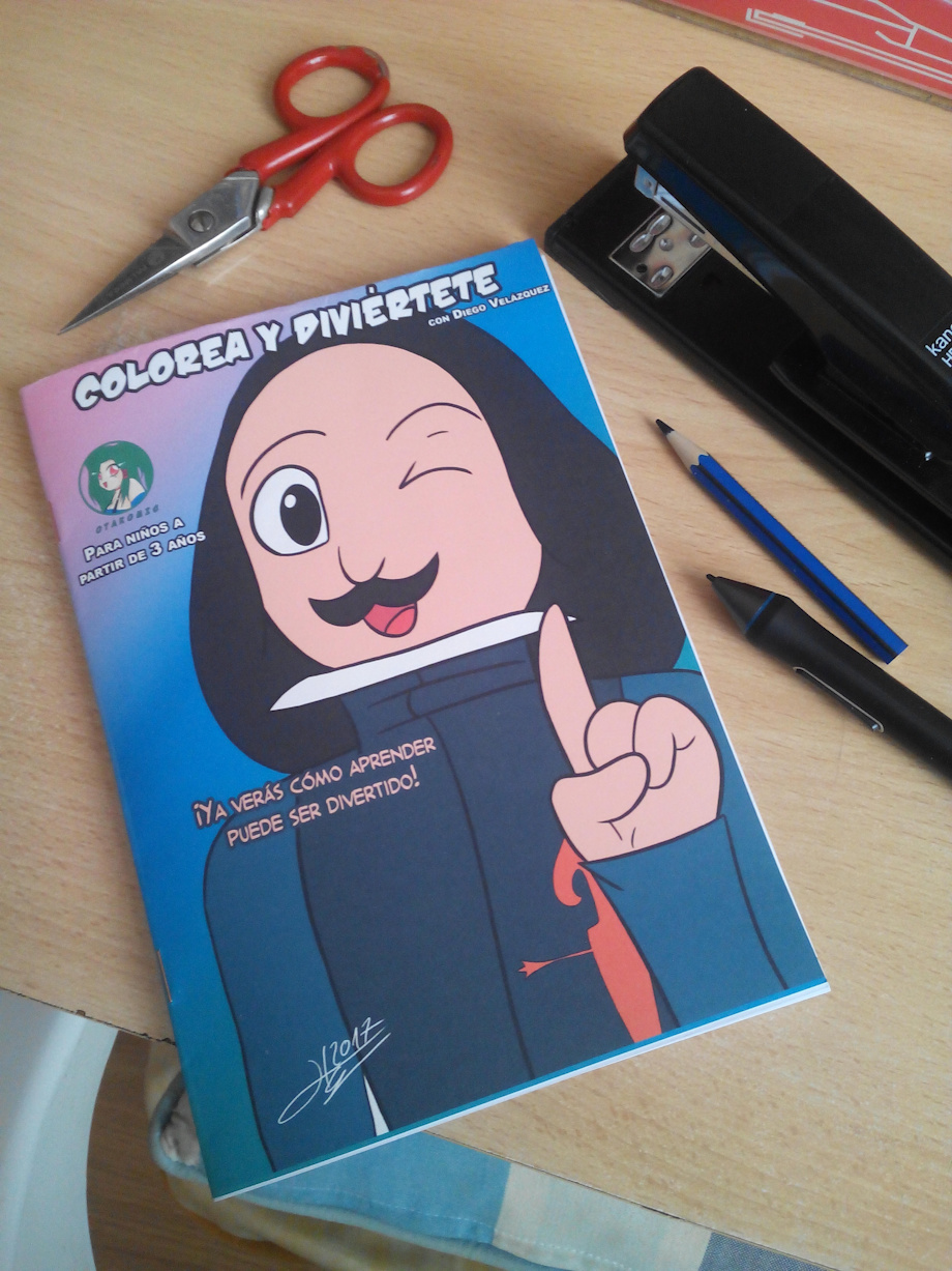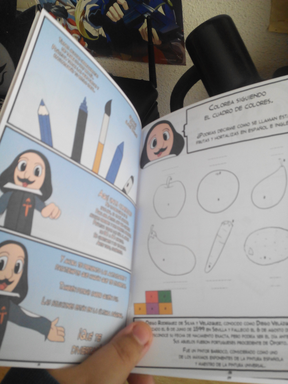 It have activities to learn spanish and english and some cheats about the color, lineart, minicomic and biography of the spanish artist Diego Velázquez, in cartoon style. =)