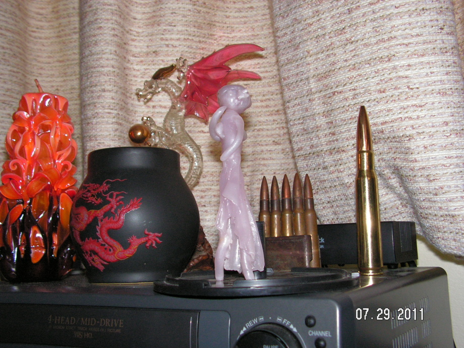 Initially, this was made by accident while molding candles. I drug a wick through the top film of the wax, and when i lifted it, it naturally formed a dress. This made me think of doing a model of Gardevoir, so I went ahead and made her! Not too good, since it's the only sculpture I've ever done, but it's far better than what I figured it would become. I'm sorry for the lack of detail in some pics. She's made out of a rose-hued wax, with a blackberry vanilla scent. I may use that in the story, come to think of it....
