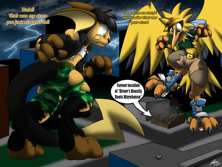 Boy, this 'rigged boots' war escalated quickly. Finally, when a thunderstorm caused us to turn into a couple of giant electric Pokémon and I accidentally stepped on Driver's business, we agreed to end it!