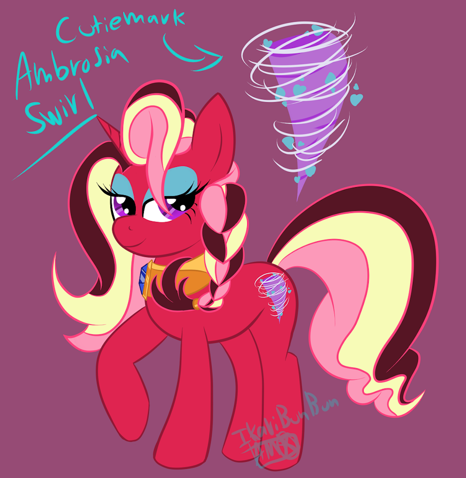 Born in Prance to a family of entertainers Ambrosia, to the lifestyle like a fish to water, enthralled by all forms of performance but no more no than exotic dancing; her introduction to the world of erotic dance was completely by mistake - having wanderd the streets of prance as a filly and coming across an open window - but the experience would change her for the rest of her life; the way the mares on stage danced was unlike anything she'd ever seen before, it was a whirlwind of sensations that threw her for a loop and, most importantly she couldn't believe just how happy all the dancing was making everypony in side it was like a hurricane of love and passion. And upon returning home her mother and father excitedly pointed out the reveal of her cutie mark.