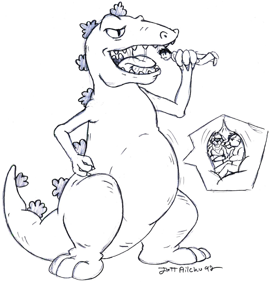 Jett and I did a joint drawing where we would each draw out our interpretation of a scenario, vore themed of course, that makes it all much more fun; and there is a serious lack of Reptar Vore Art out there.