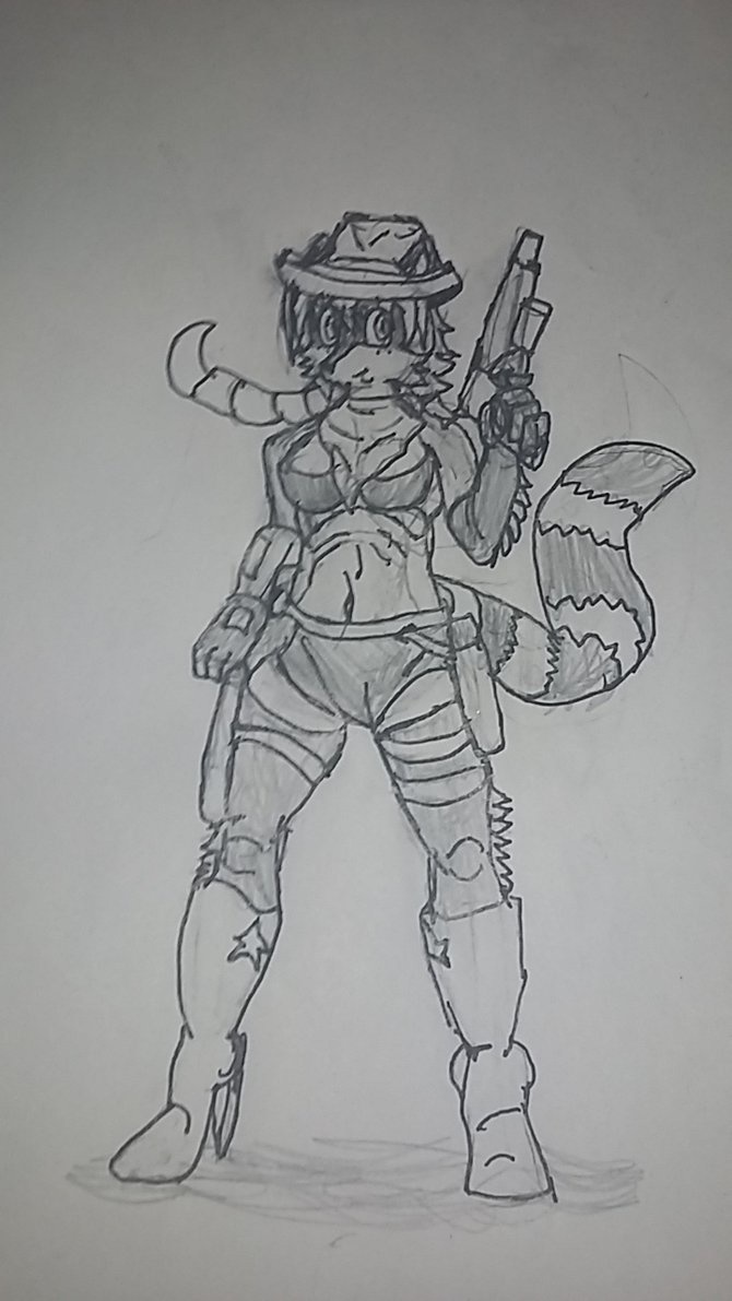 I decided to go with a space cowgirl for no discernible reason other then the fact the archetype exists, And with it being in space i could get away with making her an anthro in the similar vain to what i'm usually used to drawing, my choice being a Raccoon for A: A change from Wolves, Foxes, Bandicoots, etc etc and B: Space Raccoons are a common thing right?