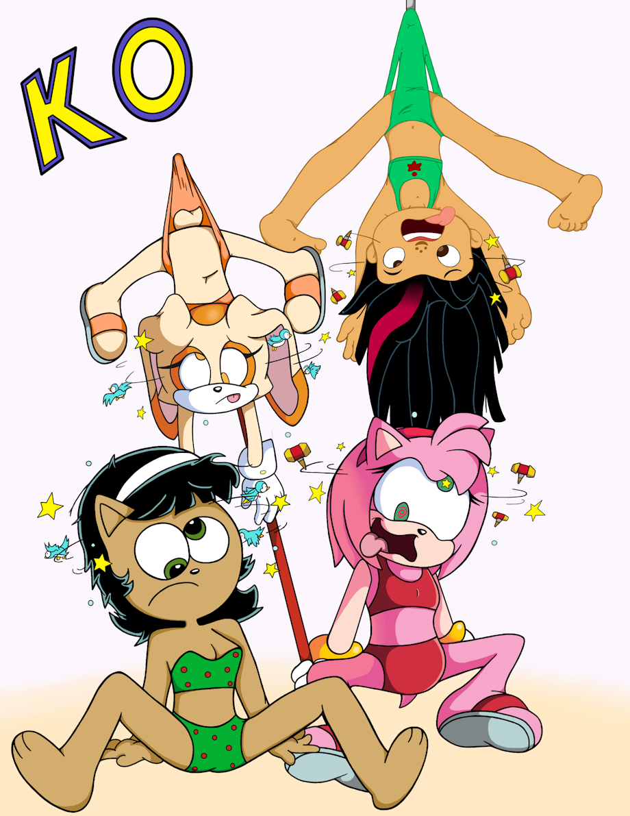Girls from different series all over come together to get acquainted with a ton of tweeting birdies and circling stars. They've been knocked out and sent to dreamland with their eyes crossed and feeling rather goofy on the inside, while looking just as silly on the outside. It's Amy Rose and Cream the Rabbit from the Sonic the Hedgehog series, Kitty Katswell from T.U.F.F Puppy, and Juniper Lee from The Life and Times of Juniper Lee.