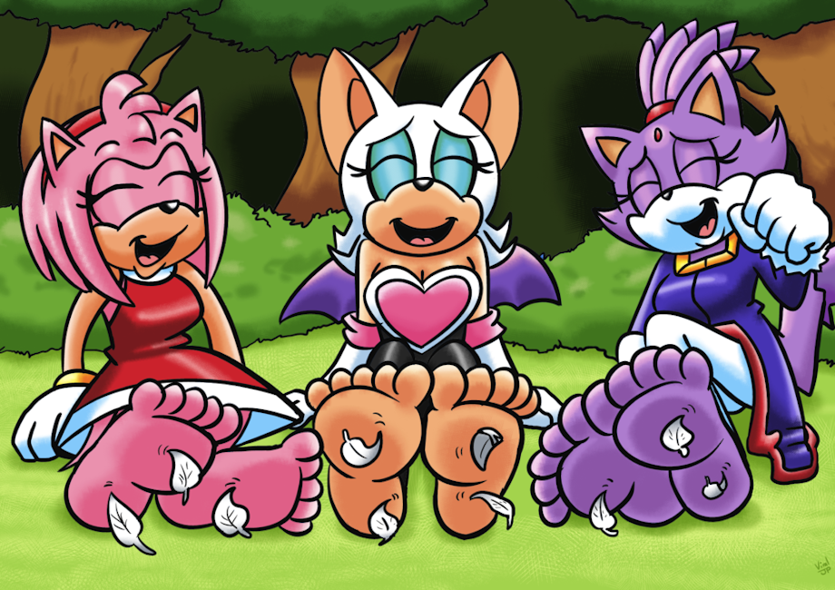 Here's a commission ViralJP made me on DA a while ago. It involves Amy Rose, Rouge the Bat and Blaze the Cat in a forest as some feathers tickle their bare feet. Need I say more?