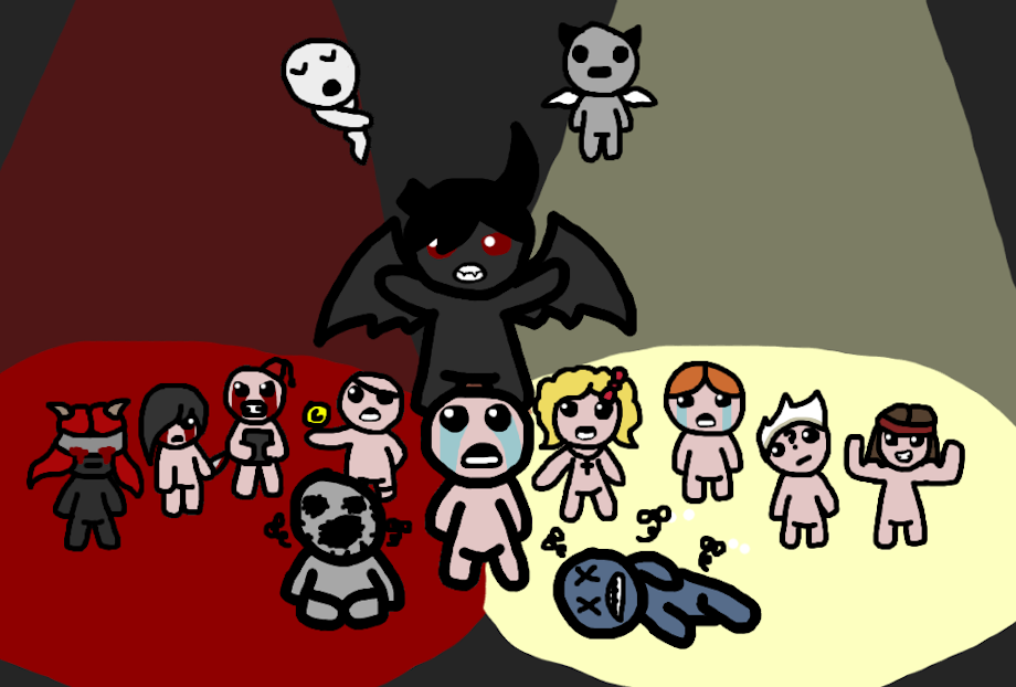 A picture of the whole cast of Binding of Isaac split between good and evil with Isaac caught in the middle of it all.