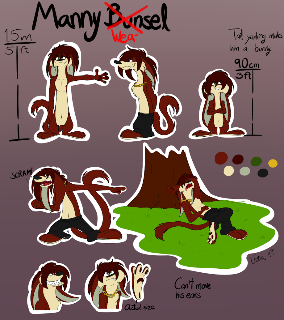 2nd gen. hybrid, so he's 3/4ths a weasel, the rest a bunny hare. The ears go down to his shoulder blades. His torso is a it too long for shirts to fit well, and since he's too thin, thicker ones are not a good solution either. Jeans are a bit too long for his stubby legs, and he has long bunnyesque paws.