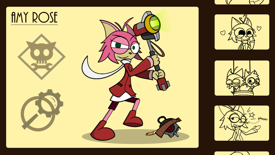 Amy is Sonic's childhood friend. She is a tomboyish gal who is known for her destructive nature. Amy is very successful in her studies and aims to be an archaeologist. However, she has a very difficult time in finding leads, thus backing out on her work and decided to took some part jobs as a filing organizer until she is needed. Fortunately, Sonic was able to find her one and decided to team up on their exploration.