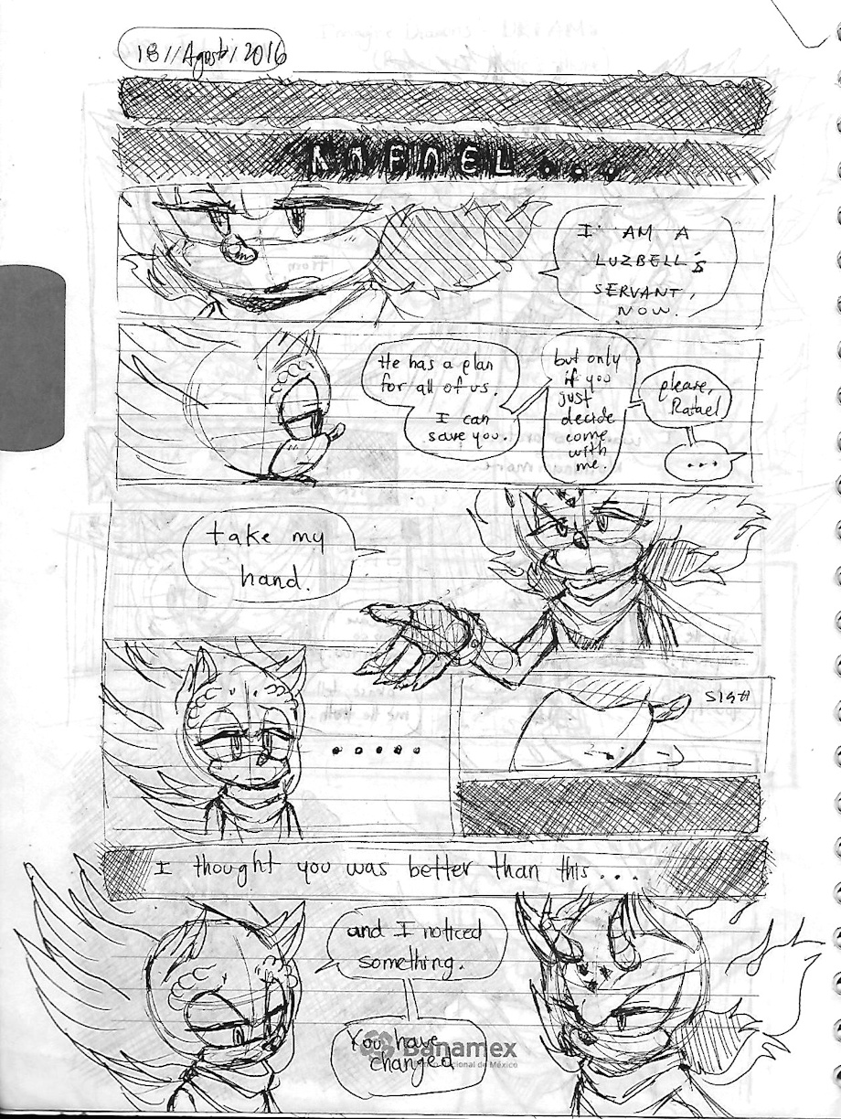 Luzbell sabe que Mefi esta muy encariñado con Rafael y así que, aquí en el comic, trata de persuadirlo diciendole que solamente eligiera a una persona en especial para salvarlo de la desvastación que planea llevar a cabo. Digamos que Rafita rechazó eso de Mefi y pues, PAM! Adios Rafita </3