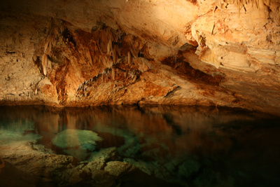 The black pool stretched on into the distance invisibly, murky green shapes of the rocks and crystals beneath the surface glittering dimly in the faint candlelight. There was no horizon visible in the huge cavern, and the sound of water dripping from stalactites echoed ruinously through the vast and open space. Everything disappeared into a black void outside of the small island of light in the center.