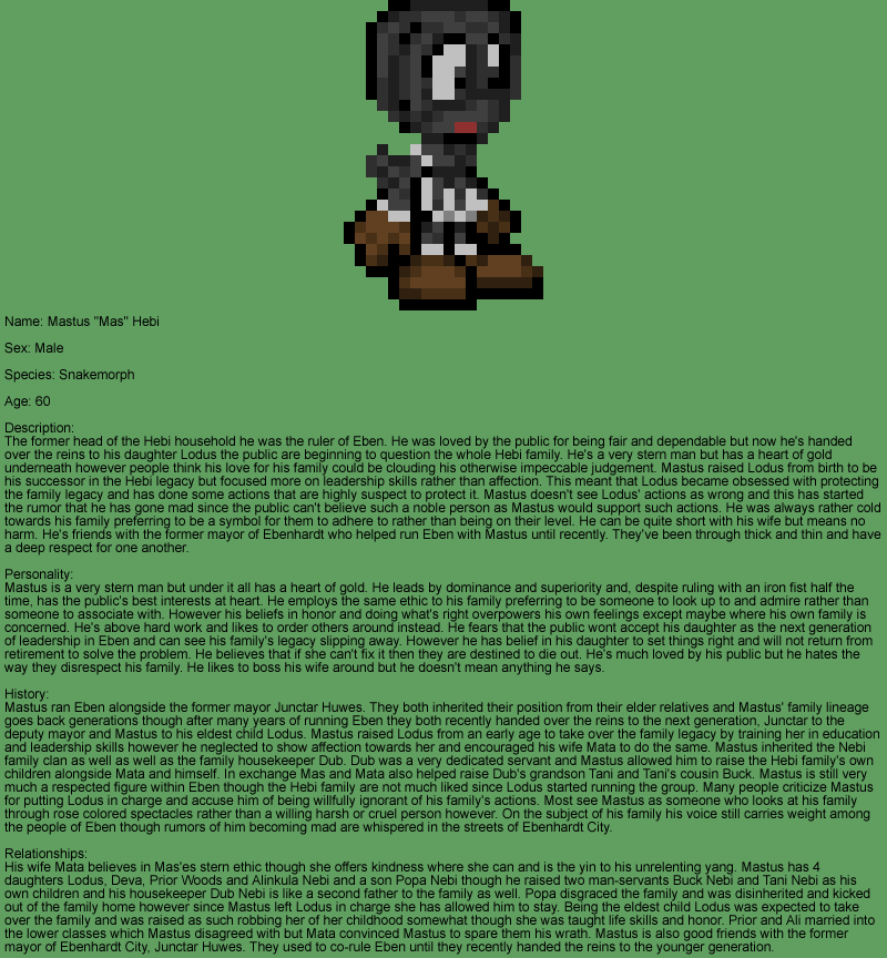 Top-left is Mastus Hebi https://inkbunny.net/submissionview.php?id=1305174 Mas is the former head of the Hebi family and was the much-loved lord of Eben until recently when he handed over the legacy to his eldest daughter Lodus Hebi. After Lodus'es attitude towards the lower classes and the things she has done people question the sanity of Mastus decision not to intervene.