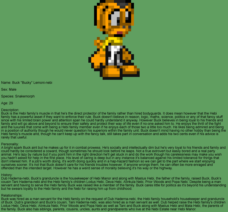 Bottom-center is Buck Lemoni-nebi https://inkbunny.net/submissionview.php?id=1305410 Though not a blood relative of the Hebi family Buck was raised alongside the Hebi family's children as a member of the family due to family home's housekeeper Dub Haderna-nebi's request, Dub being a long-term family friend of the Hebi's and the grand-uncle of Buck. Buck provides the muscle for the Hebi family and is boundlessly loyal if not very bright.